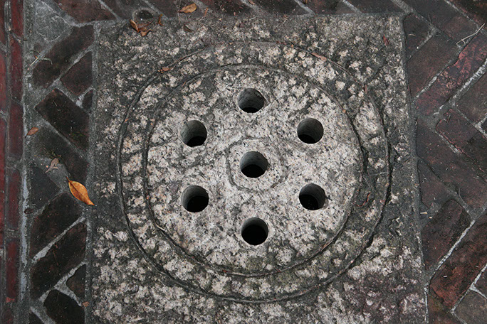 描述Description: 方形孔蓋,有兩圈圓形的圖案,內層圓圈內有有7個孔洞,形狀特殊。