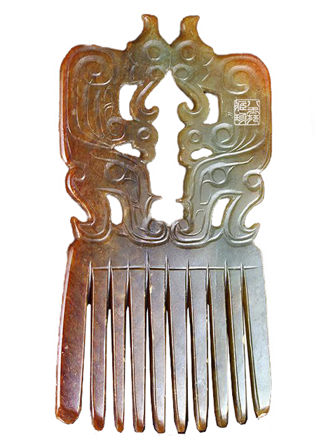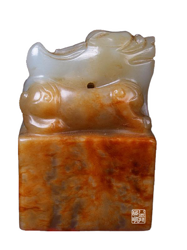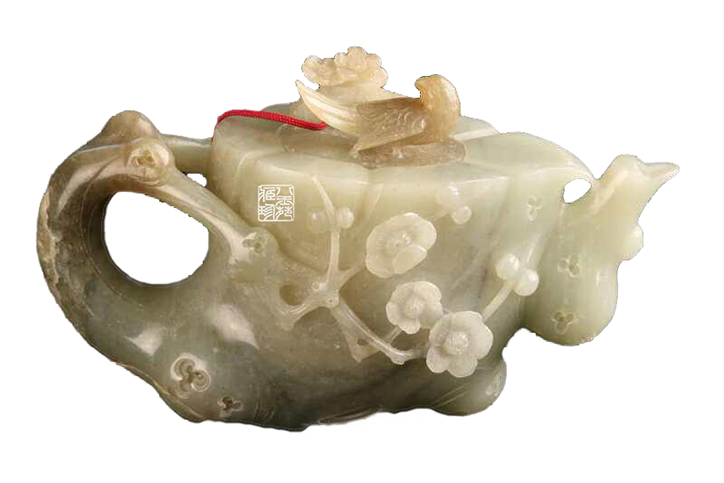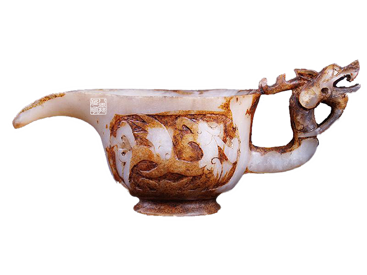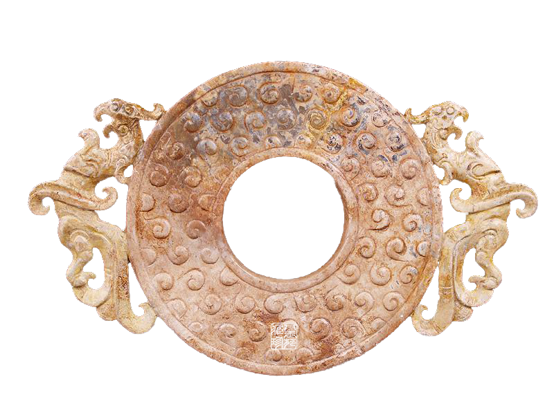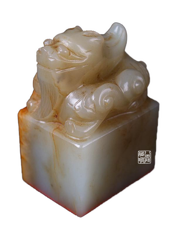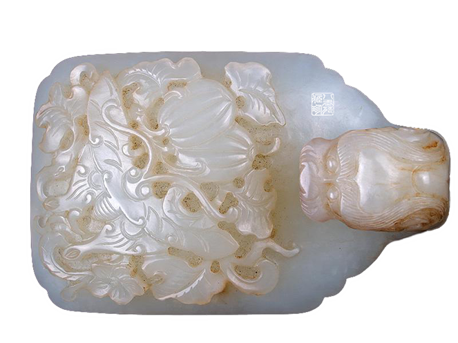 青白玉,局部留有赭斑,質地細膩溫潤。